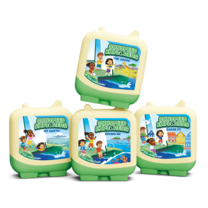 Sunspeed Explorers is a fun. educational series about three eco-conscious friends. Raj. Aya and Mia. who explore climate change using the RRR approach: Reduce. Reuse. Recycle. Your explorers need only pop this Clever Tonie on their Toniebox to start their sustainability adventure.